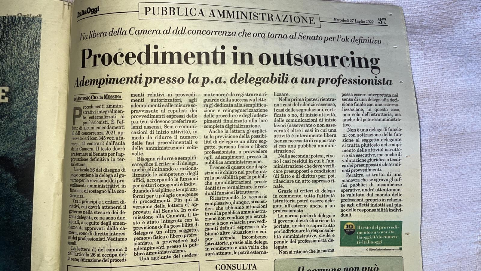 - Italia oggi del 27 luglio 2022 pagina 37 procedimenti in outsourcing a firma Antonio Ciccia Messina